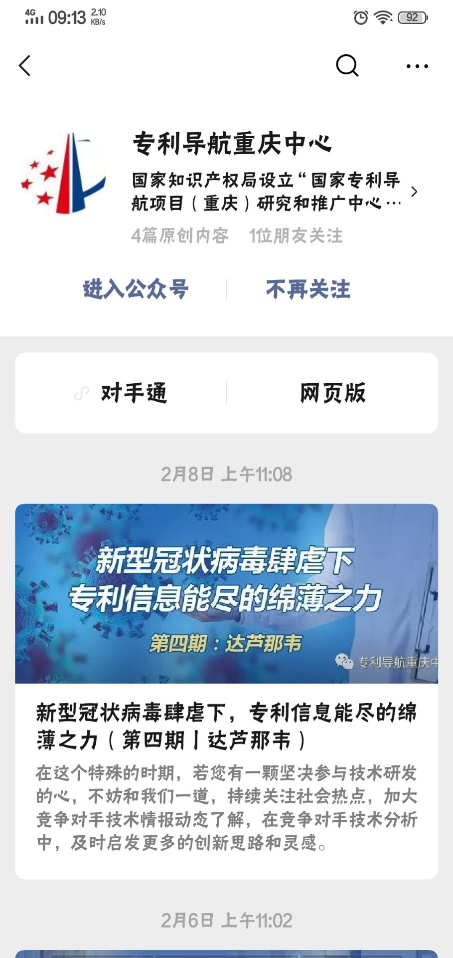 首先,需要打開您的微信:找到|“公眾號”,點擊進(jìn)去,點擊上方“+”號,輸入:“專利導(dǎo)航重慶中心”,點擊關(guān)注。