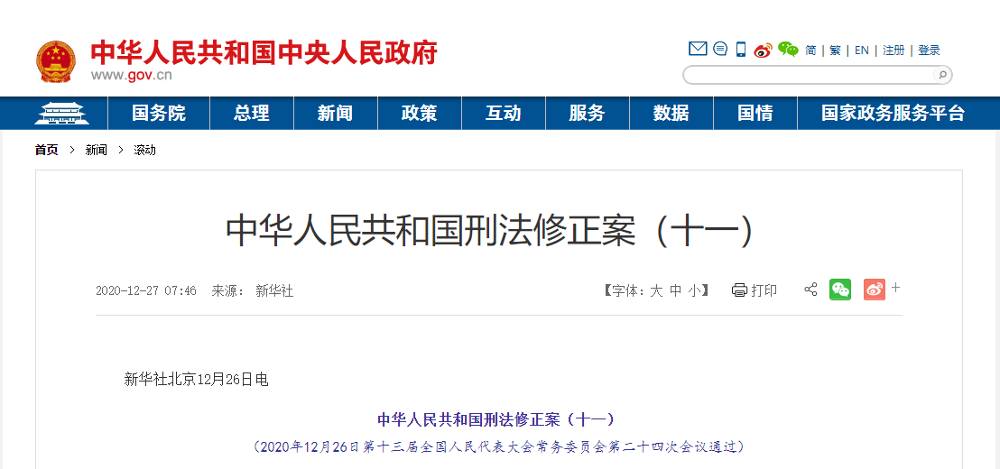 2020年12月26日,第十三屆全國(guó)人大代表大會(huì)常務(wù)委員會(huì)第二十四次會(huì)議在京舉行。本次會(huì)議通過(guò)了《中華人民共和國(guó)刑法修正案(十一)》,本次修正案將于2020年3月1日起實(shí)行。
